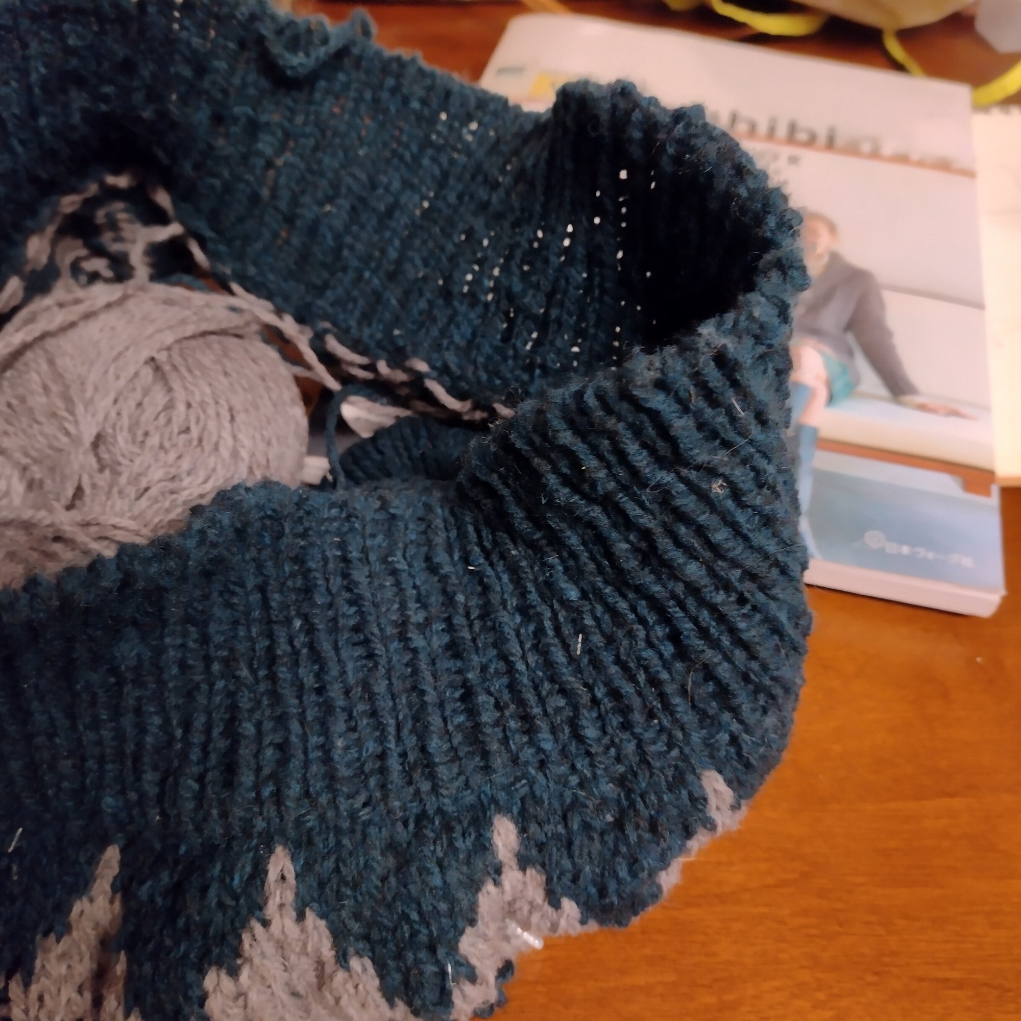 襟のゴム編みを編んで、気に入らなくてほどき、